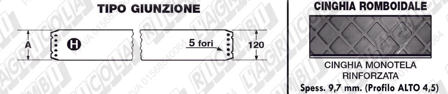 CINGHIA ROMBOIDALE H=120 - L=1660 - 5 Fori (details) (dettagli) | Use on .Costrutt. Vari | Gall.: Kverneland: Welger 0933 7204 00 |