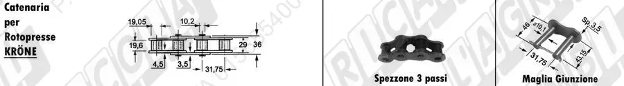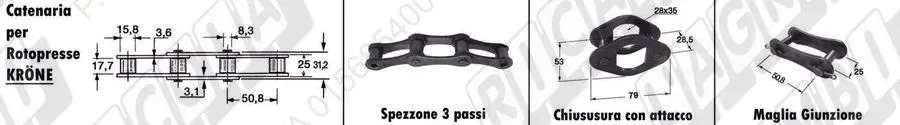 | new | NR | 2 | 66.000-G | CATENA Solo SPEZZONE 3 Passi - Passo 1'1/4 (dettagli) | Imp. su Kröne | Fortima V1500, Fortima V1800, RP 601-30, 601-31, RP 601-40, 601-41, KR 10-16, 10-16S, KR 8-16, 8-16/8,-16S, Combipack 1250 1250MC, Combipack 1500, Variopack 1500,1800 | 920.607.0 | |