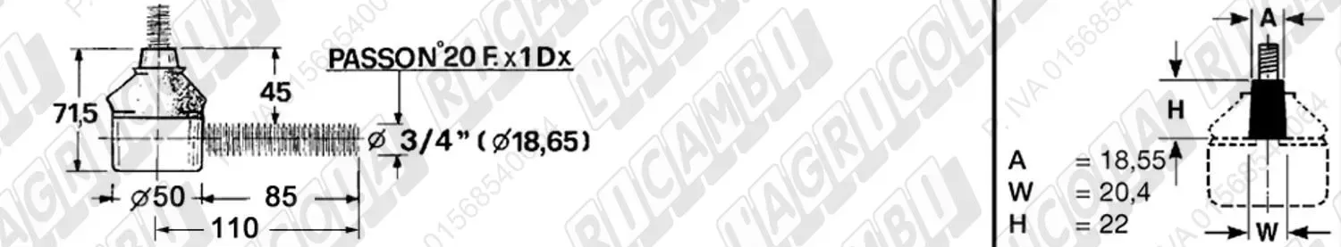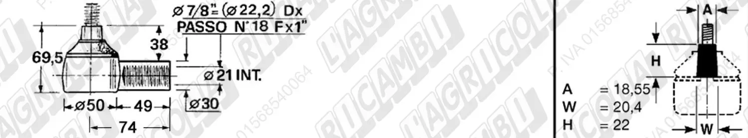 Testina Idrog. FEMMINA - Cono 18,55 - Fil. ø22,2 (7/8'x18) Dx - L= 74 (dettagli) | Imp. su David Brown | K929057 | |