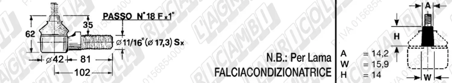 Testina MASCHIO - Cono 14,20 - Fil. ø17,3 (11/16') Sx - L=102 (dettagli) | Imp. su John Deere | AE 20389 |