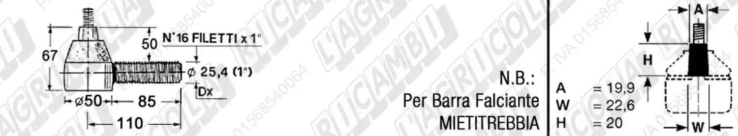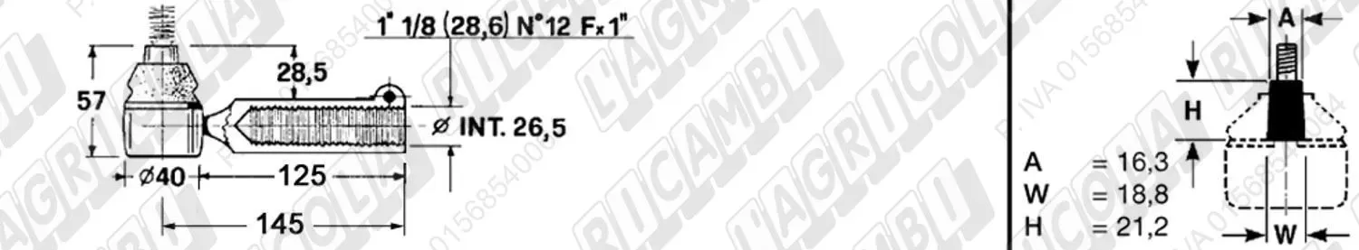 Testina FEMMINA - Cono 16,20 - Fil. ø26,5 (1'1/8) Dx - L=145 (dettagli) | Imp. su John Deere | AT 27130 | |