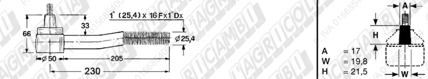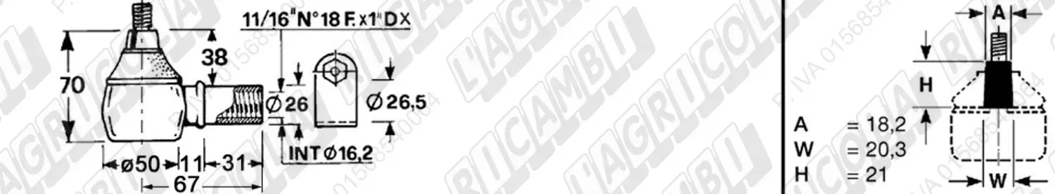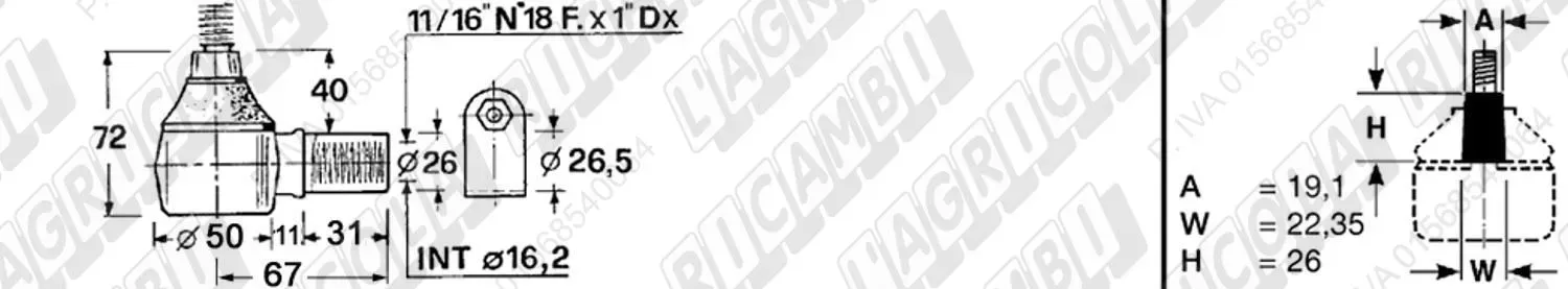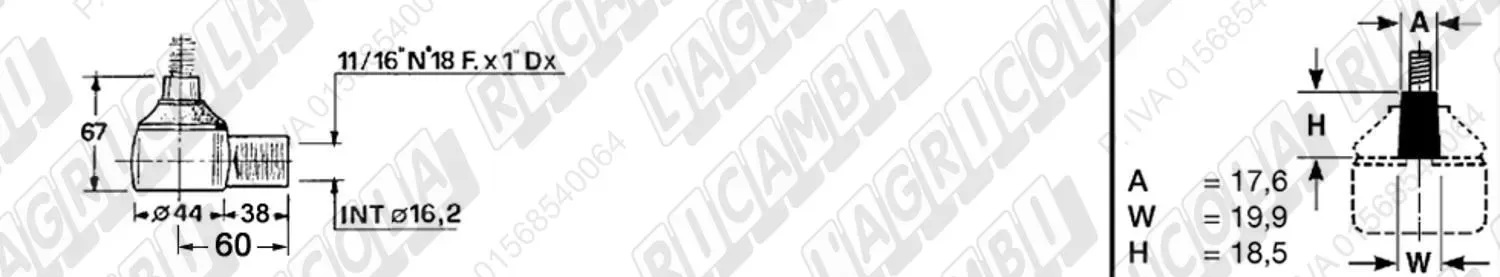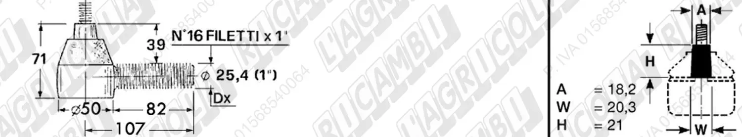Testina Idrog. FEMMINA - Cono 18,55 - Fil. ø22,2 (7/8'x18) Dx - L= 74 (dettagli)