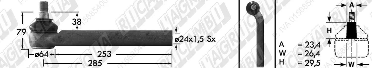 Tirante Idrog. Centr. FEMM. - Cono 23,40 - Fil. ø24x1,5 Dx - L=285 - Dx Piega (dettagli)